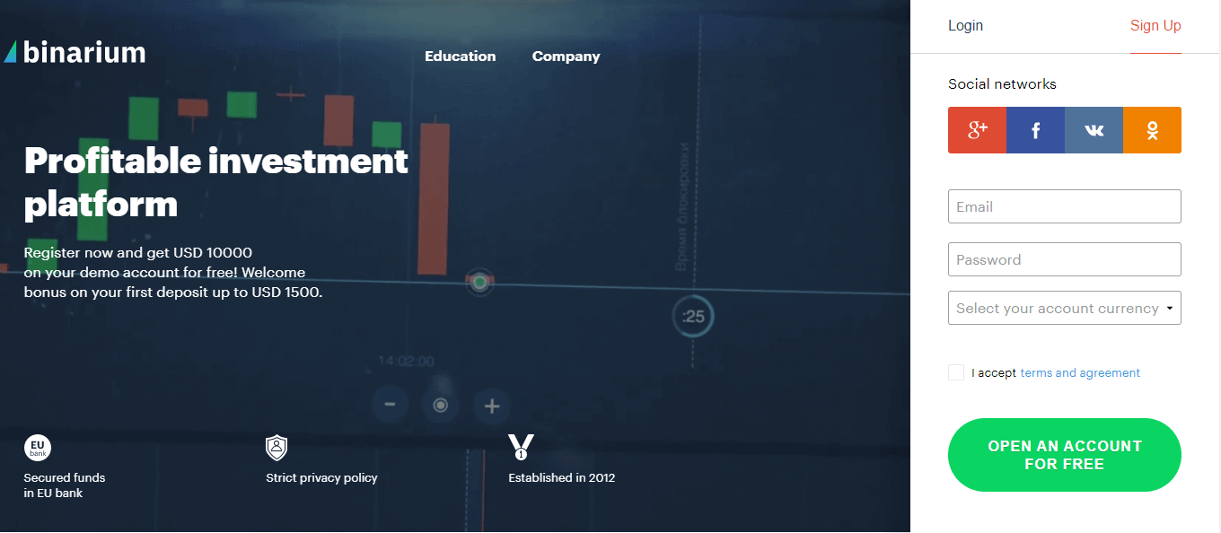 جیسا کہ پہلے لکھا گیا ہے، Binarium پلیٹ فارم اپنے تاجروں کے لیے سازگار حالات پیدا کرتا ہے، جیسے کہ کم از کم ڈپازٹ، رقم کی فوری واپسی، اور رجسٹریشن۔ آپ اپنے ای میل یا سوشل نیٹ ورکس کا استعمال کرتے ہوئے صرف چند کلکس میں رجسٹر کر سکتے ہیں۔ رجسٹریشن کے فوراً بعد، آپ ٹریڈنگ پلیٹ فارم کی تمام خصوصیات تک رسائی حاصل کر سکتے ہیں۔